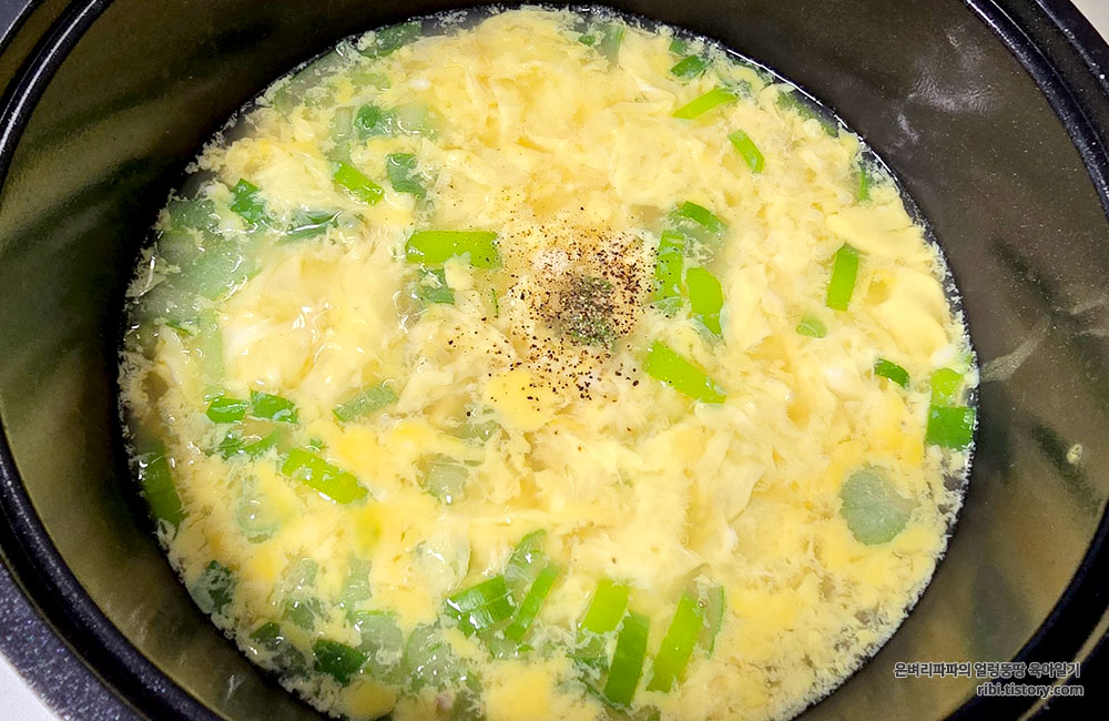 마지막으로 후추 한 꼬집 넣으면 부드러운 계란국 완성입니다.