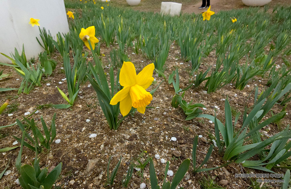 수선화는 아직 만개하기 전이었고, 튤립은 이제 막 연두연두한 잎을 올리고 있더라고요.