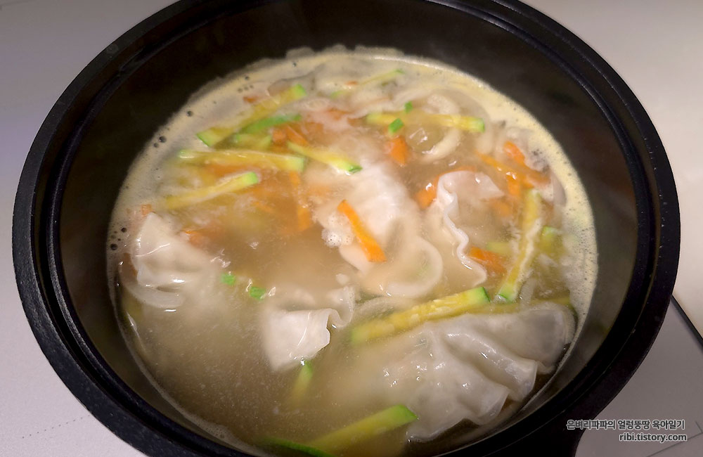 끓기 시작하면 냉동만두를 넣고 다시 한번 한소끔 끓여주세요.