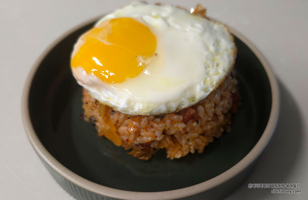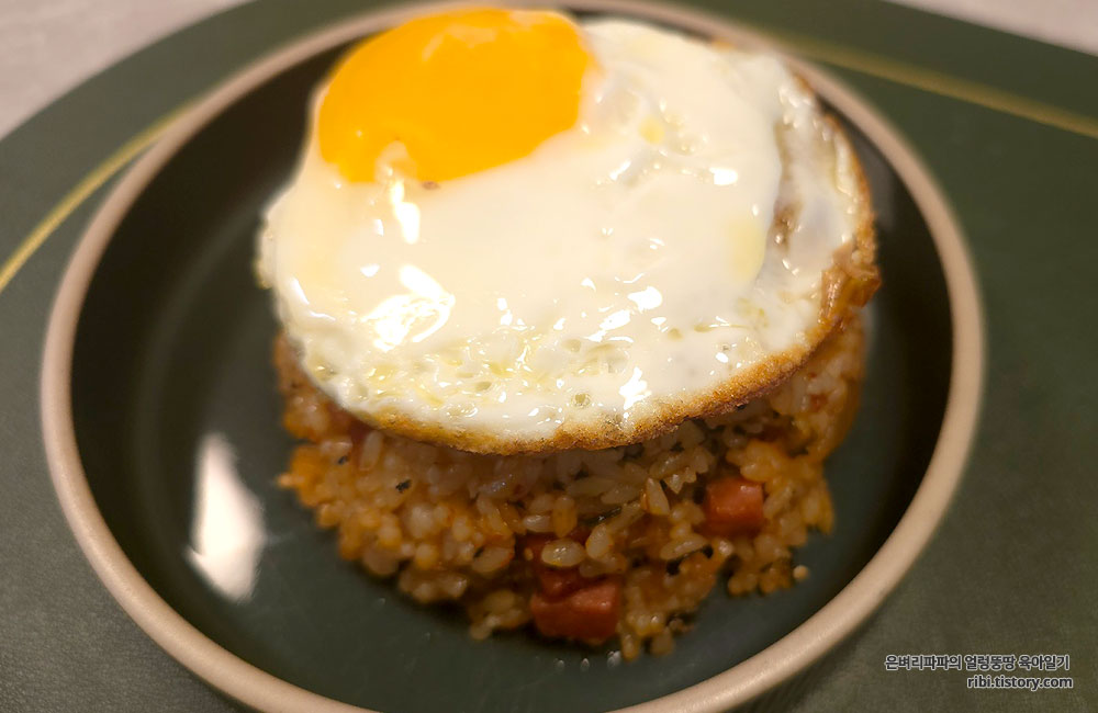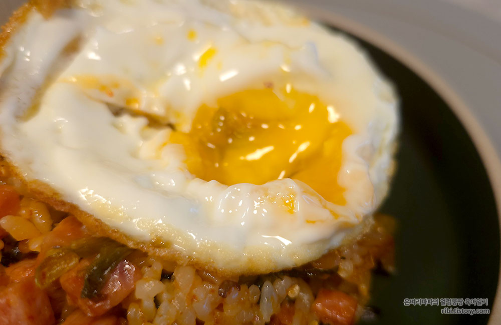 계란 노른자를 터트려 스팸김치볶음밥과 슥슥 비벼 먹으면 정말 꿀맛입니다.