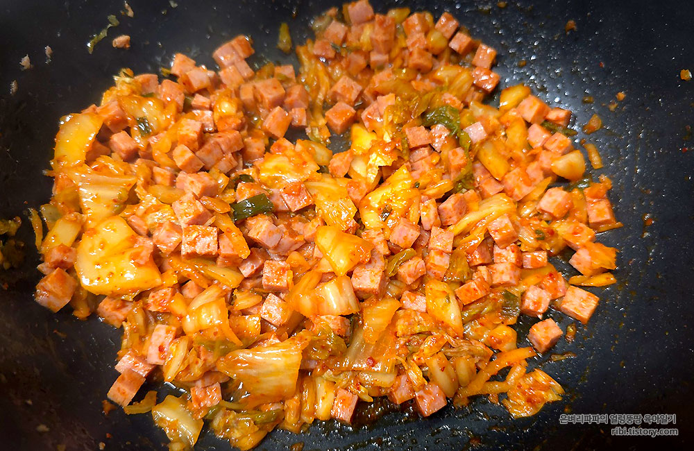 김치가 어느정도 볶아지면, 햄이랑 섞어 다시 볶아주세요.