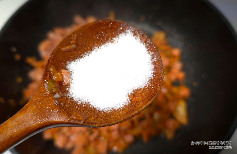 이때, 설탕 한큰술을 넣어 김치의 신맛을 중화시켜 줍니다.
