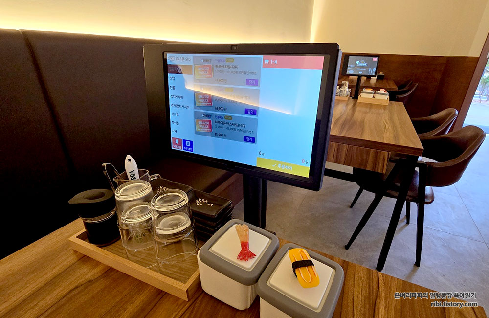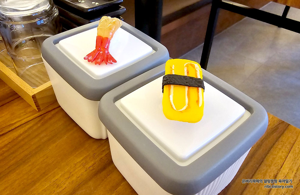 테이블에 앉자마자 시선을 사로잡았던 초밥모양의 손잡이 용기~