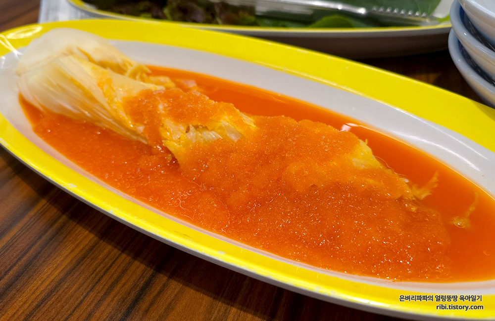 집게와 가위를 이용해 먹기 좋은 크기로 잘라, 함께 결들 여진 양념장에 콕 찍어 먹으면 되는군요.