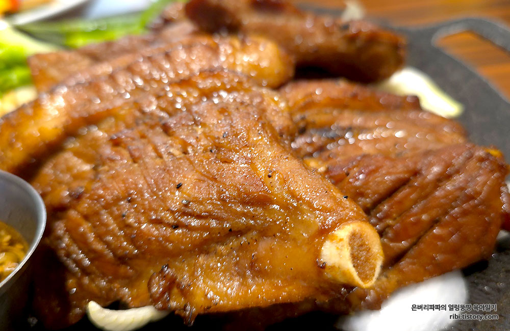 다 구워져 나온 돼지갈비를 먹기 좋은 크기로 잘라 취향껏 즐기기만 하면 끝~