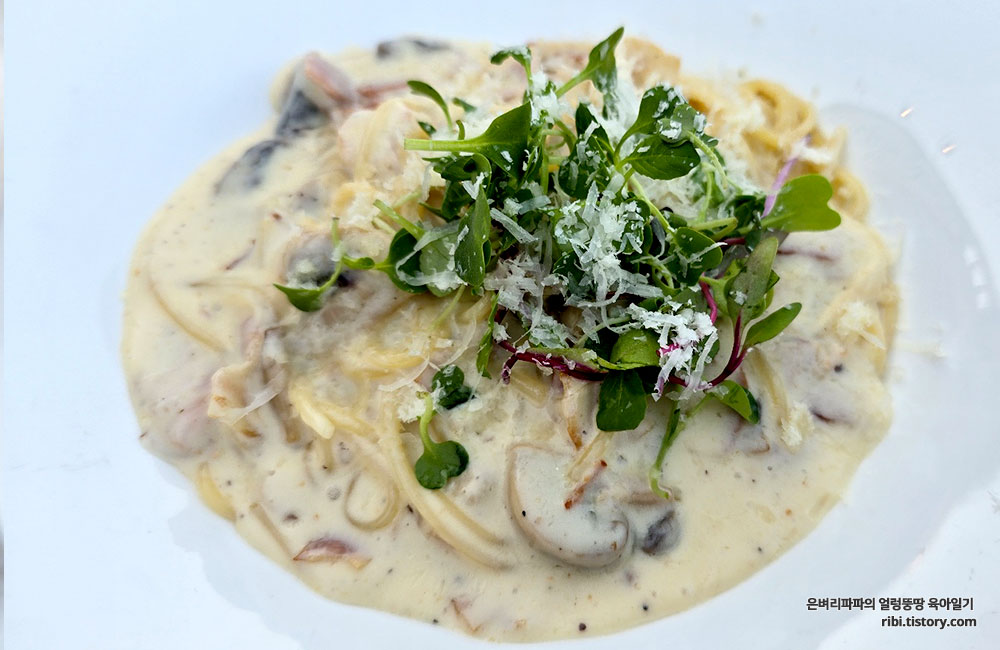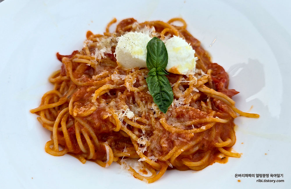 베이컨크림파스타와 토마트소스 베이스의 뽀모도로파스타입니다.