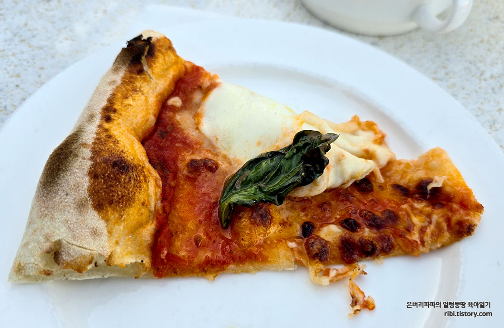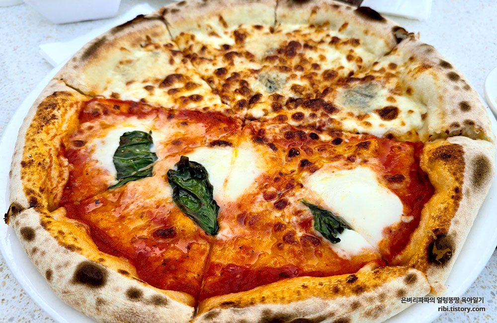 진한 양송이 수프를 다 먹어갈 때쯤, 마르게리타와 고르곤졸라로 반반 구성된 하즈&하프피자가 나왔어요.