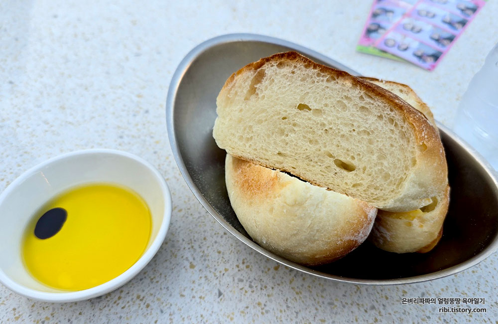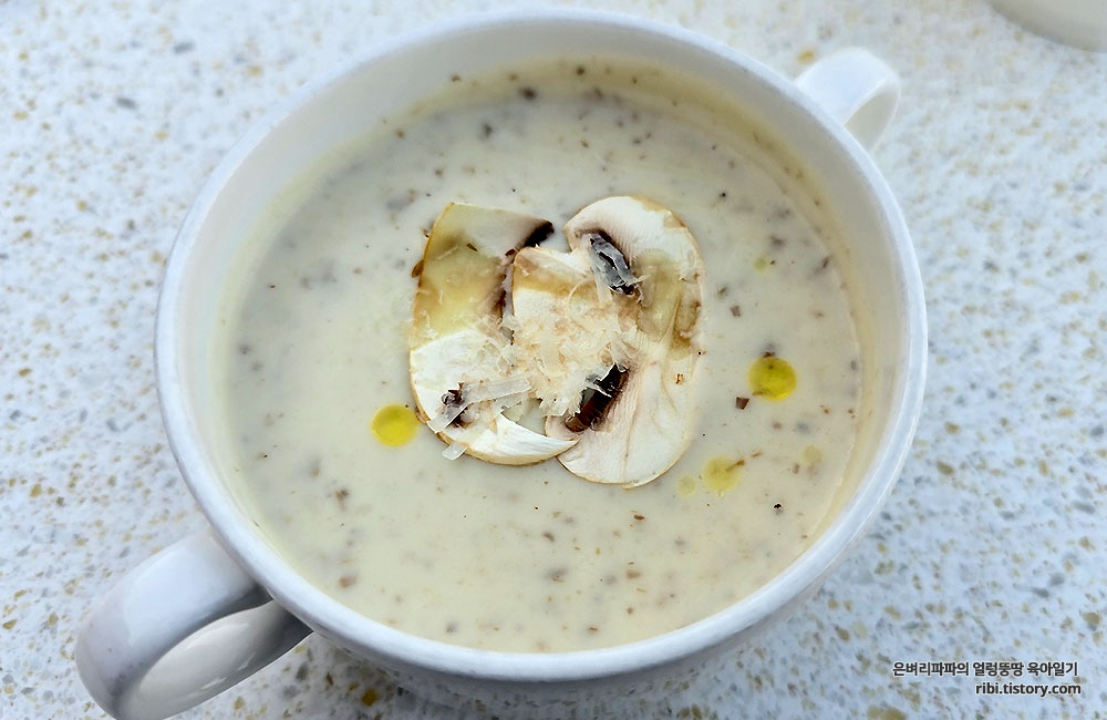 식전빵과 오렌지에이드 1리터, 양송이수프가 먼저 나왔습니다.