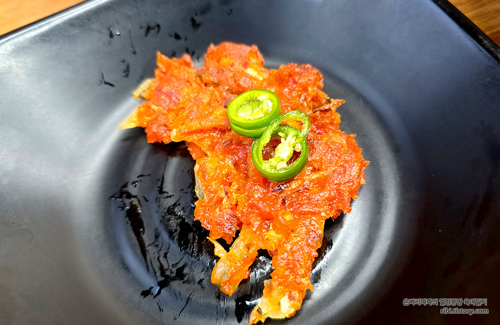 다른 음식이 나오기 전, 고기김치전을 먼저 먹어봤어요.