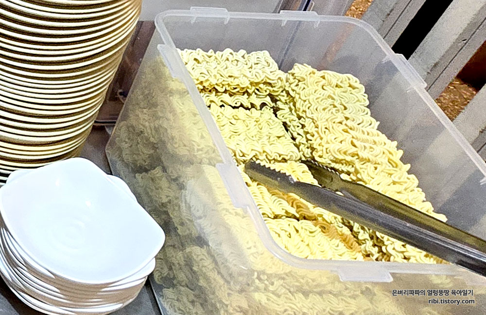 셀프바에서 반찬을 더 추가하고, 라면사리까지 챙겨 옵니다.