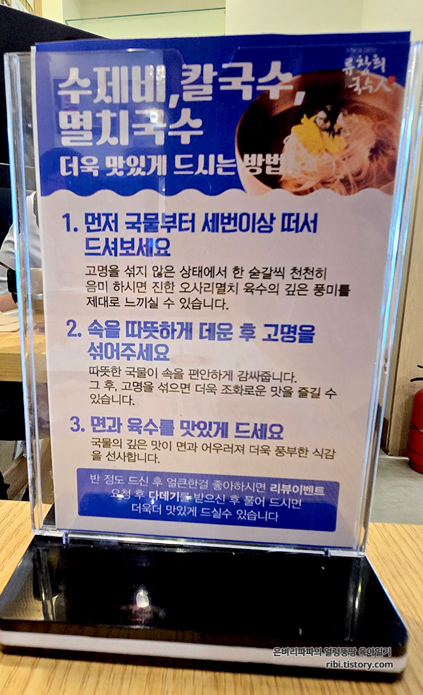 이전과는 다르게 뜨근한 수제비와 칼국수, 국수를 맛있게 먹는 법이 안내되어 있습니다.