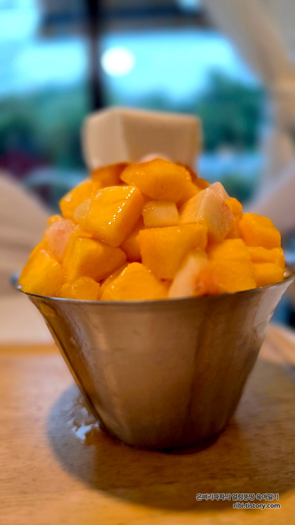생망고빙수가 유명한 곳이지만, 지금은 제철 생복숭아빙수가 더 인기 있는 것 같아요.