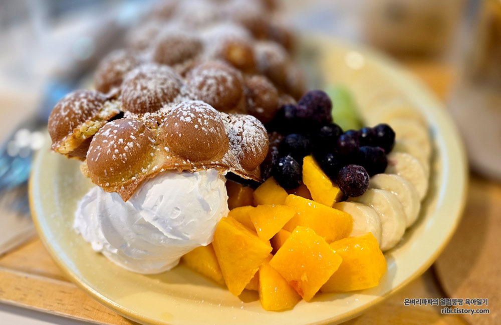 생복숭아빙수와 동그리 과일 와플(홍콩식 에그와플)을 주문하고,