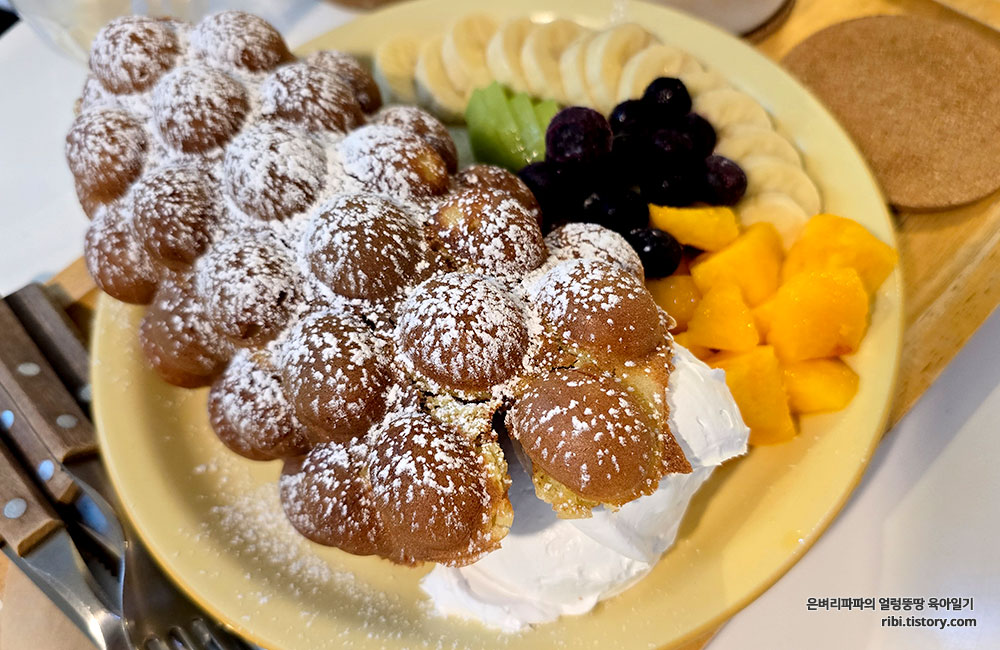딸아이를 위해 생과일이 잔뜩 올라간 동그리 홍콩와플도 먹기로 했습니다.^^