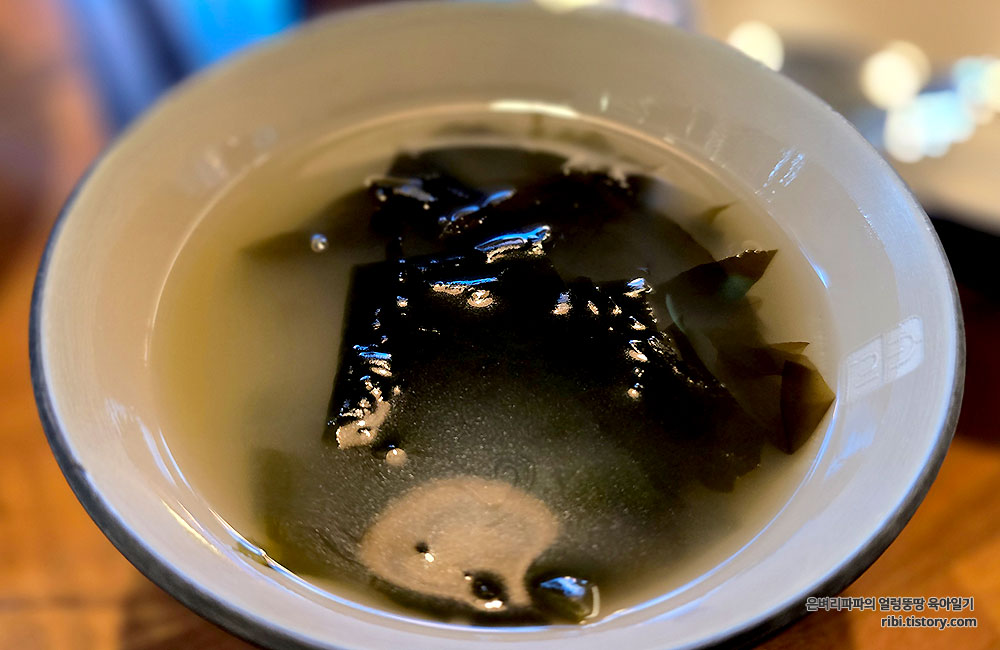 상큼한 키위드레싱의 양상추 샐러드와 뜨끈한 미역국이 먼저 나왔어요.