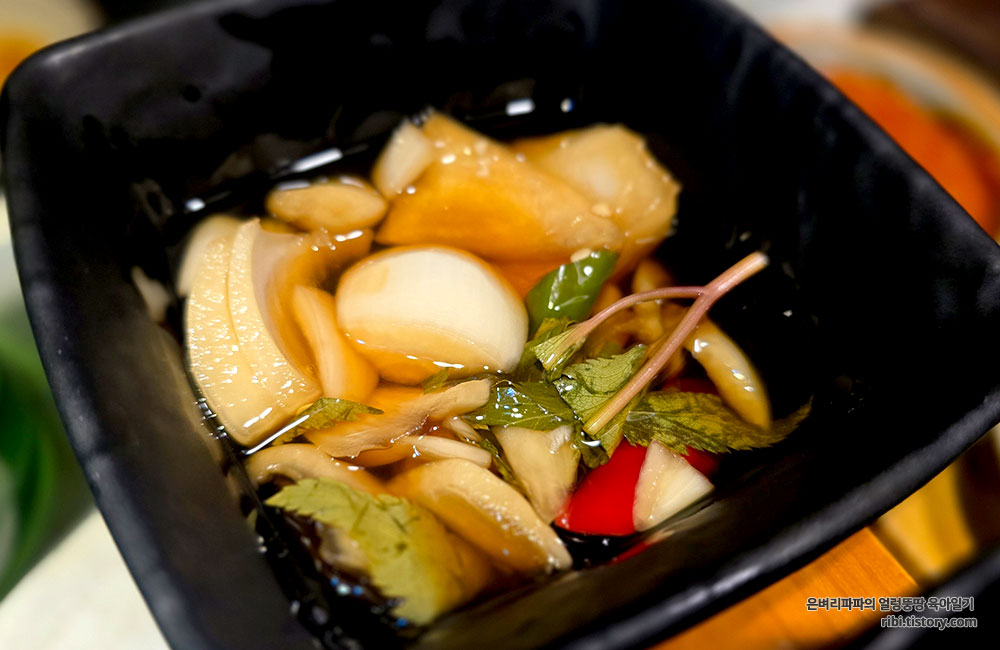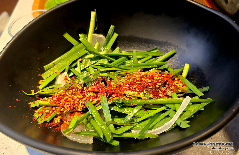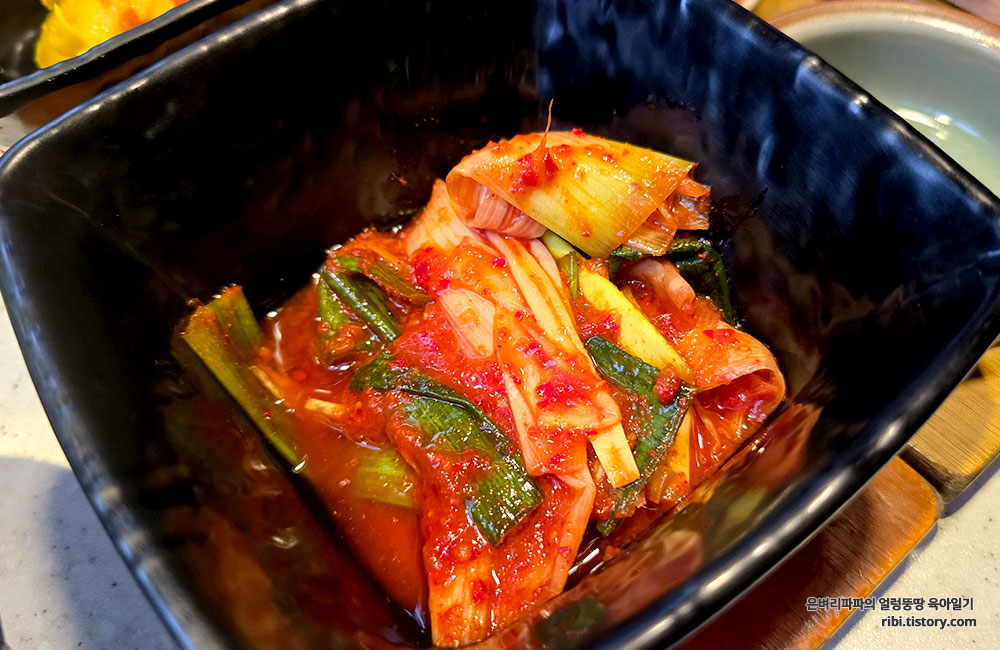 양파부추 겉절이를 비롯해, 대파김치, 단호박샐러드, 장아찌가 기본반찬으로 제공됩니다.
