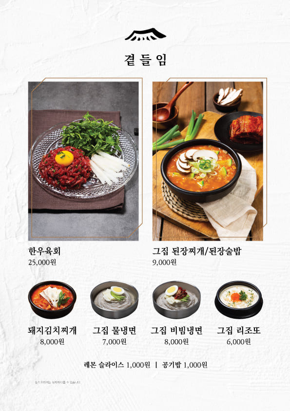 메뉴는 구이류와 곁들임 메뉴가 있습니다.