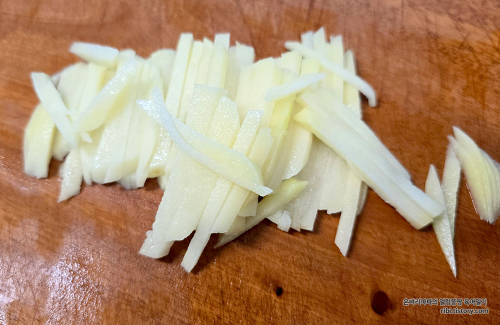 먼저 감자는 껍질을 벗기고 가늘게 채 썰어 준비합니다.