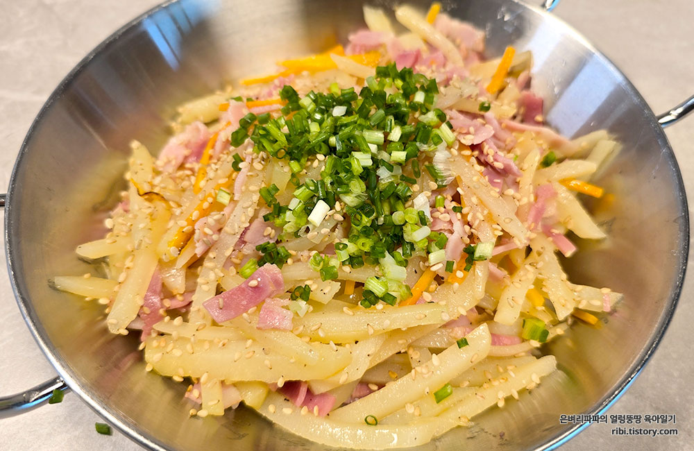 포실한 감자의 고소함에 베이컨의 고소함이 더해진 베이컨감자채볶음 완성입니다.