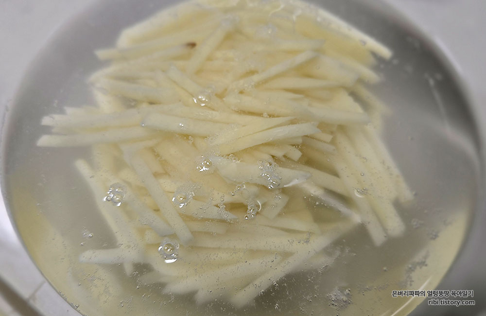 찬물에 담가 전분기를 제거하지 않으면 볶으면서 감자가 눌어붙기 쉬워요.^^