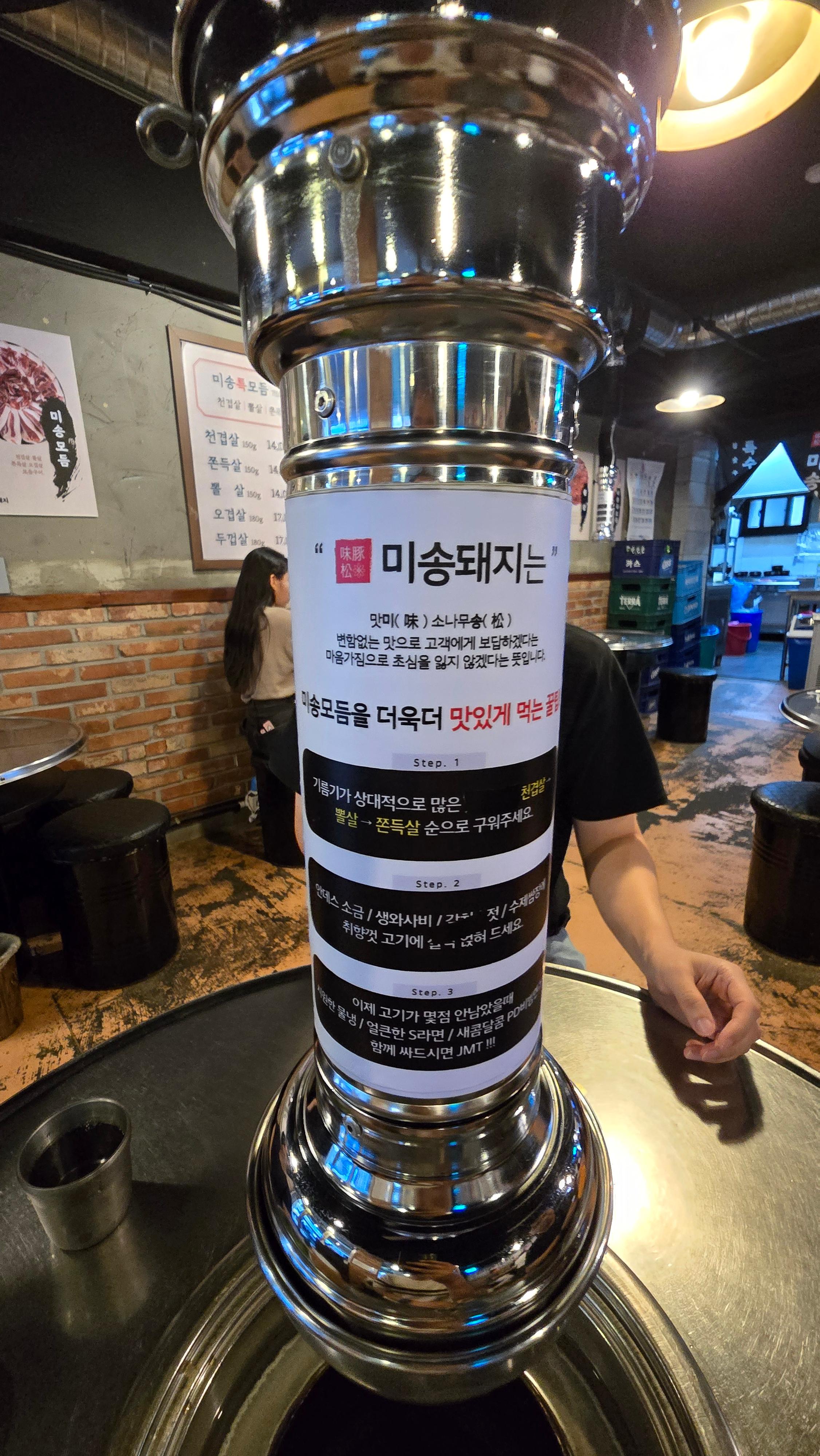 각 테이블의 환기구 기둥에 미송모둠을 더 맛있게 먹는 방법을 소개하고 있습니다.