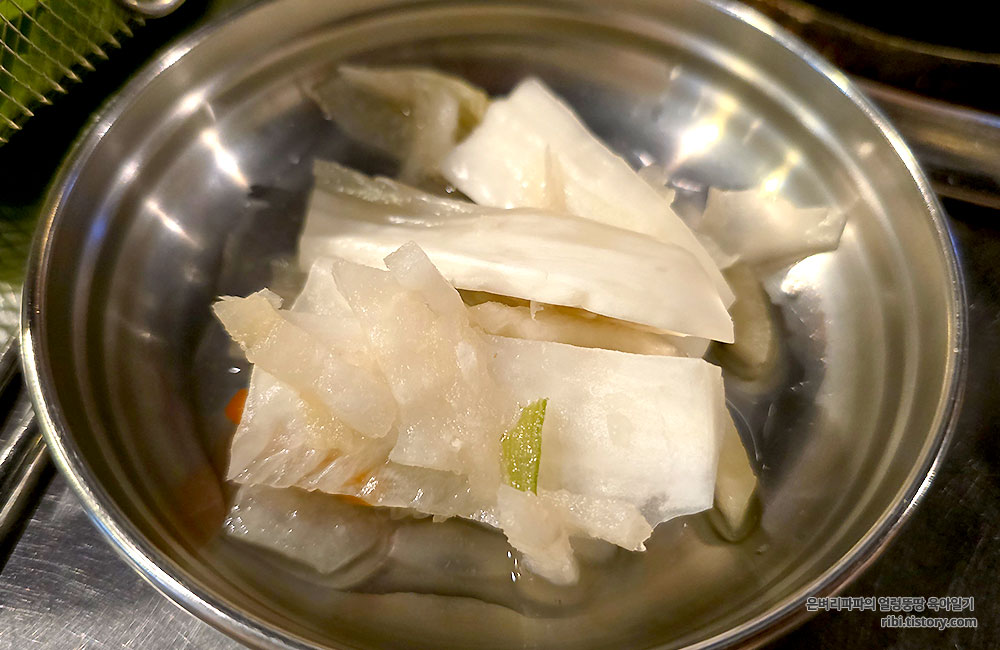 개인용 양파절임과 부추겉절이, 백김치, 양배추피클이 나왔습니다.