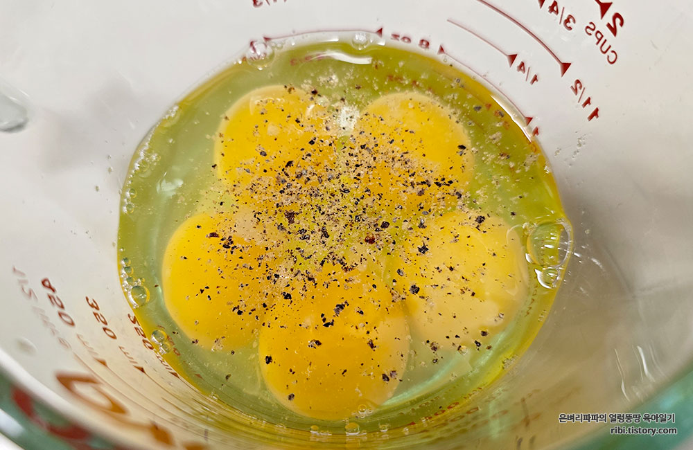 계란 5개를 깨트리고, 소금과 후추로 간을 해주세요.