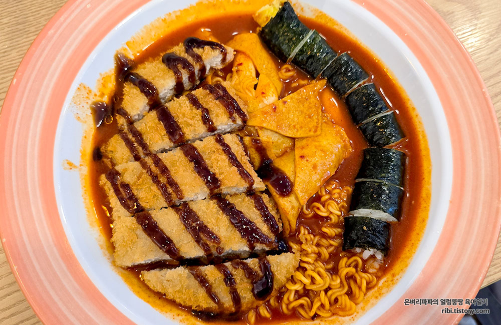 누구나 아는 그 맛의 라볶이에 꼬마김밥 한 줄과 돈가스가 올려진 메뉴입니다.