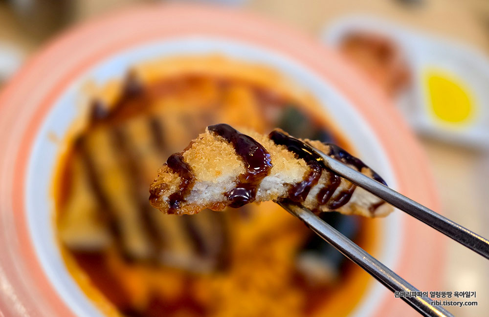 돈가스는 갓 튀겨내어 겉은 바삭하고 속은 촉촉합니다.