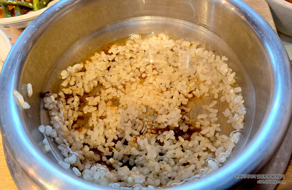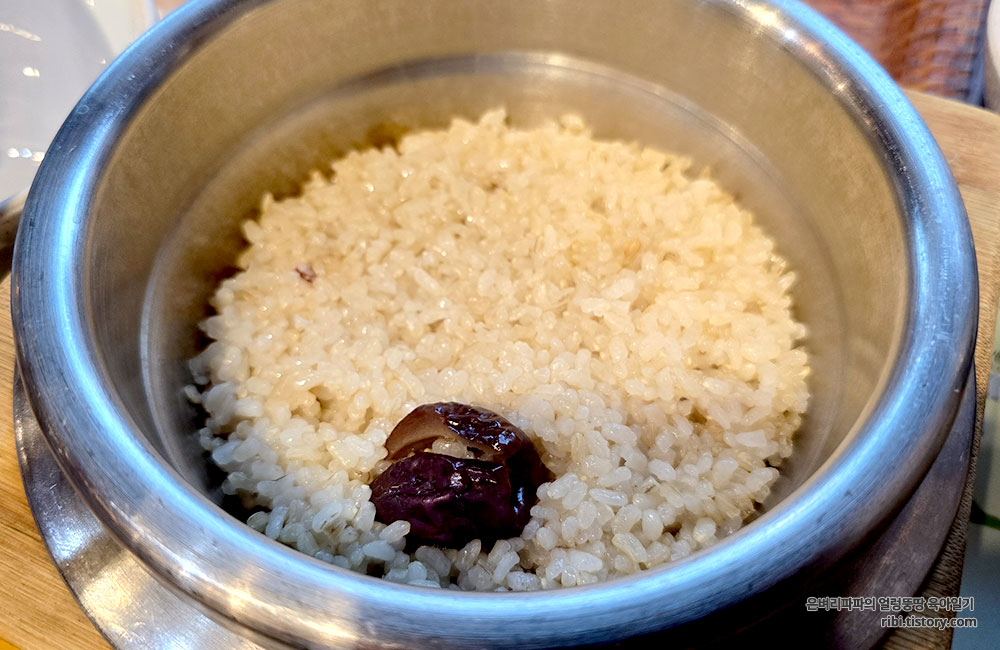 신선한 쌈채소와 다양한 고기요리를 즐기고 있을 때, 당일 도정한 황미솥밥이 나왔습니다.
