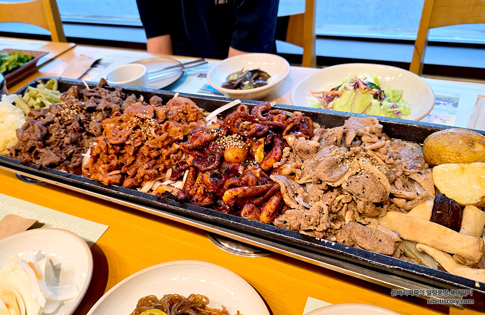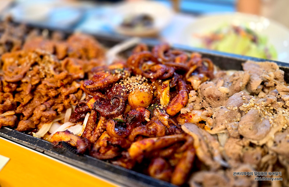 소, 돼지, 주꾸미, 오리고기가 다양하게 조리되어 있습니다.