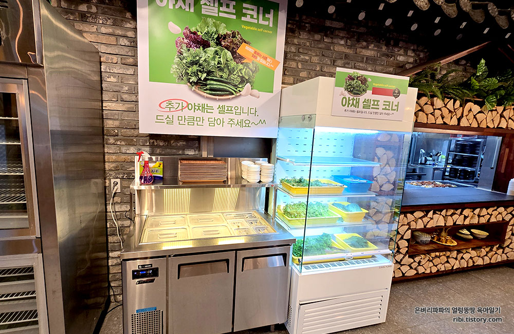 쌈채소가 먼저 나오고, 추가 채소는 셀프바를 이용하면 된다는 안내를 해주시네요.