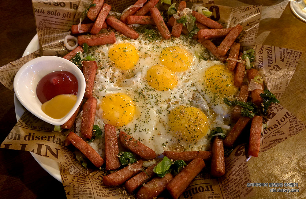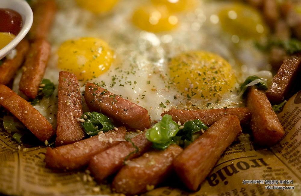 계란 노른자는 반숙으로 구운 프라이와 튀기듯 바삭 구운 스팸이 맥주안주로 정말 좋습니다.