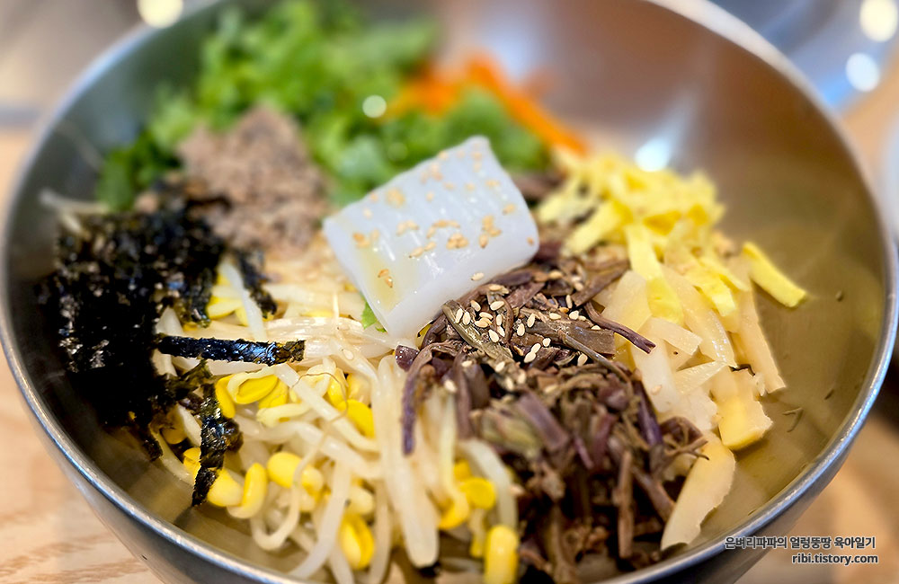 다양한 재료가 올라가 있어, 테이블에 놓인 비빔장을 개인 취향 따라 넣어 비벼주시면 됩니다.