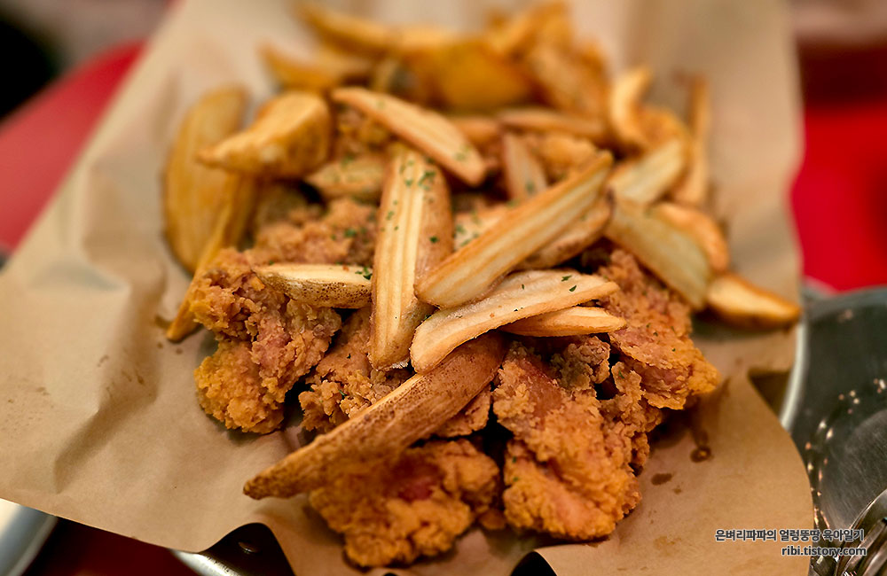 그리고 갓 튀겨 나온 크리스피 한 순살치킨과 겉바속촉의 반달감자입니다.