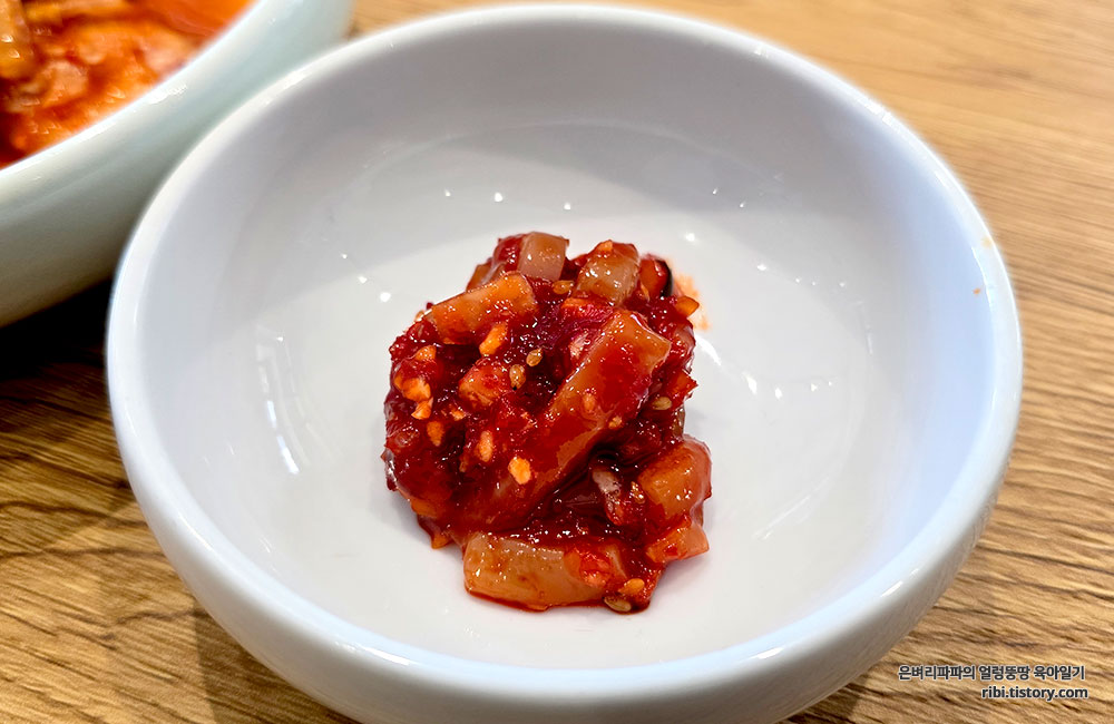 섞박지와 배추김치, 오징어젓갈, 그리고 개인용 소스입니다.