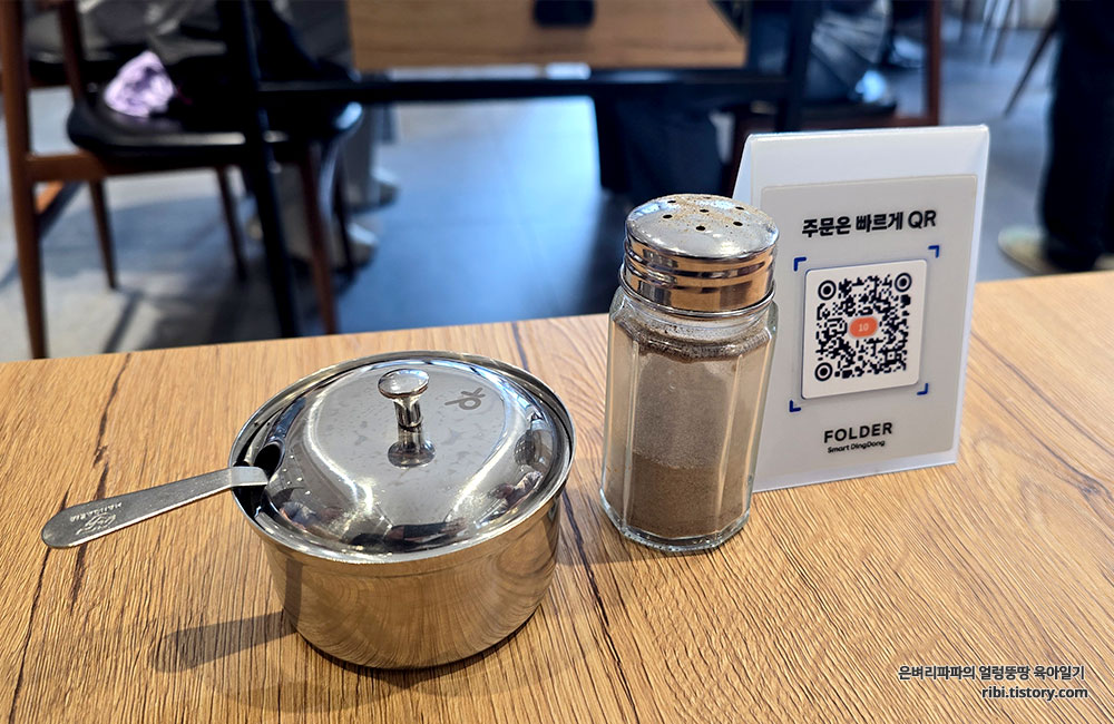 테이블에는 소금과 후추, 주문을 할 수 있는 QR코드가 놓여 있습니다.