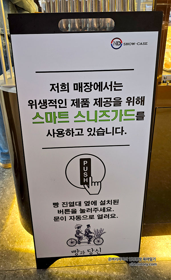 원하는 빵을 담을 때만 버튼을 누르고 유리문이 열리면 빵을 담는 방식입니다.