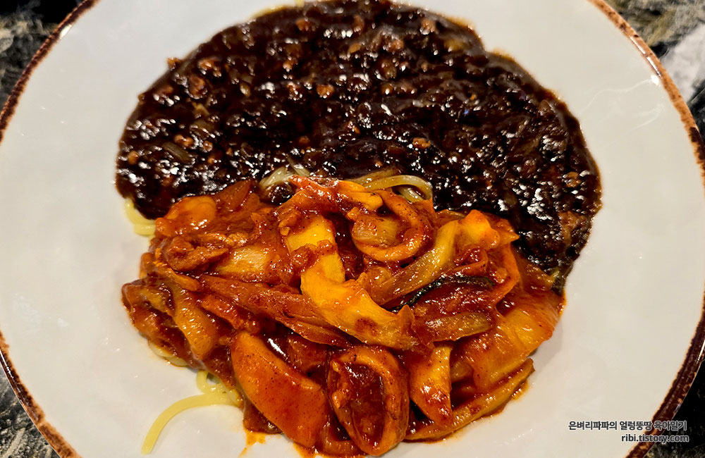 자칫 느끼할 수 있는 짜장의 맛을 매콤함이 살아 있는 불맛의 해물볶음이 어우러져