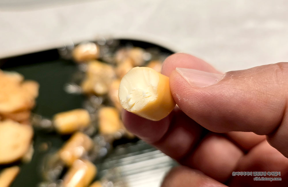 겉으로 보기에는 소시지처럼 생겼는데, 씹으면 쫄깃하고 부드러운 치즈의 식감입니다.