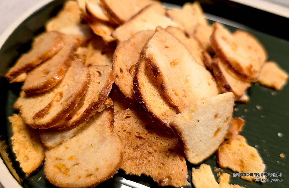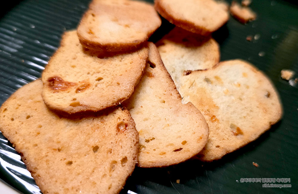베이글을 얇게 썰어 바삭하게 구워낸 칩인데, 식감이 매우 바삭바삭해서 씹는 재미가 있습니다.