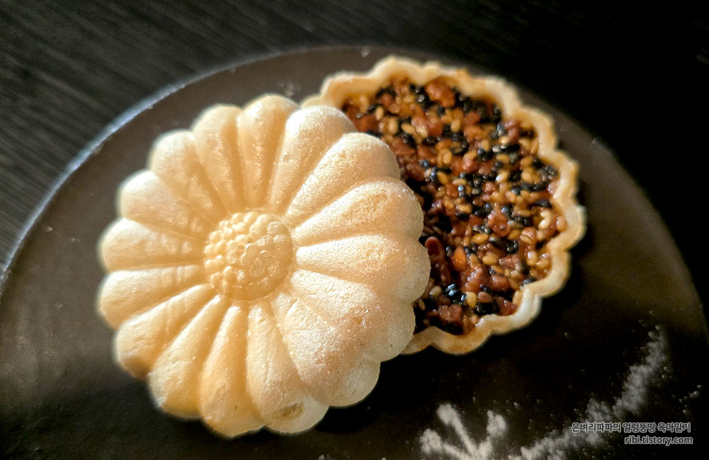 전통 디저트인 모나카에 깨강정이 들어간 디저트예요.
