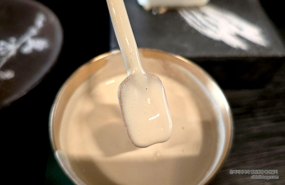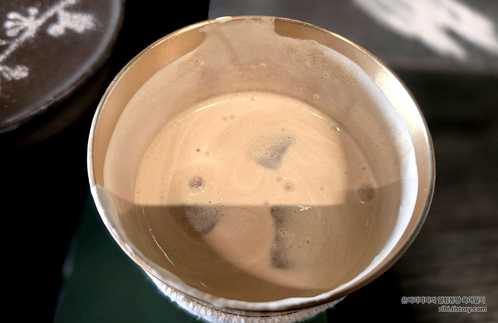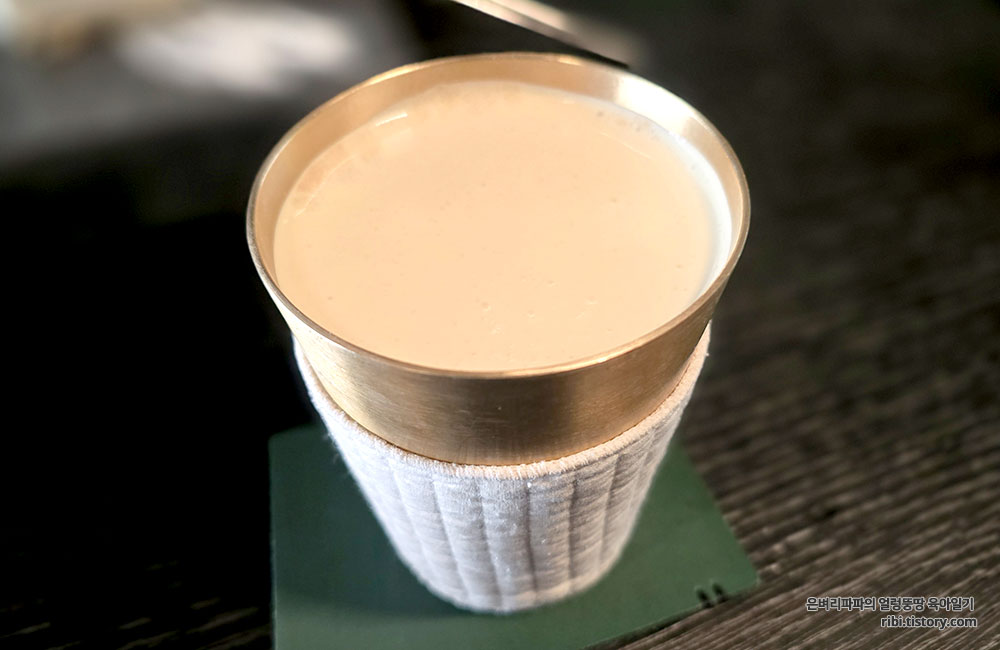 호암라테는 전통 놋재질의 용기에 나왔습니다.
