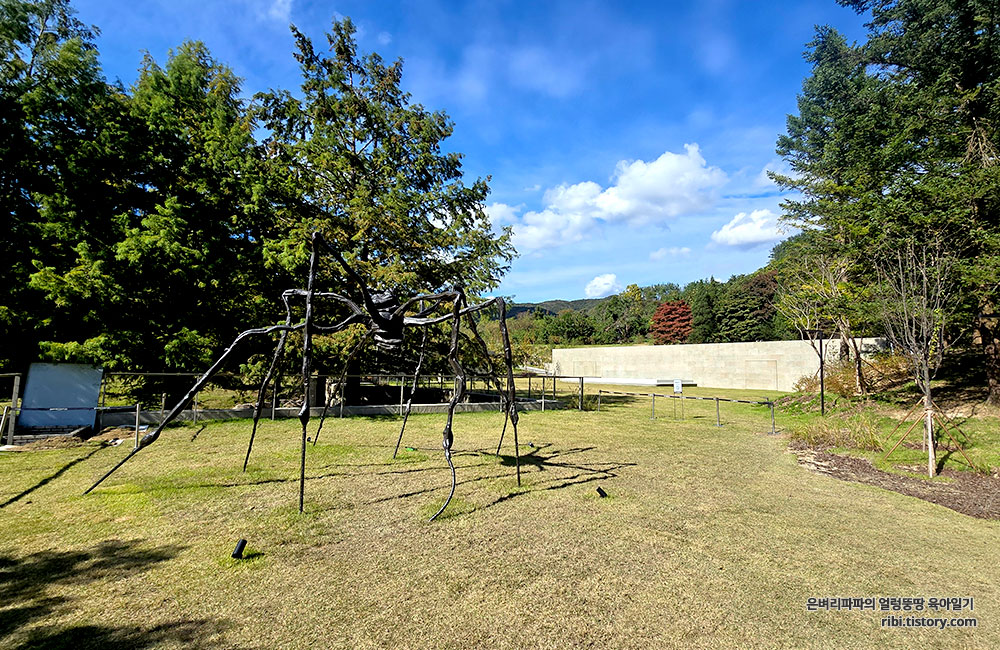 호암미술관 연못에 세워져 있는 루이즈 부르주아의 작품인 마망, 거대 거미가 새겨져 있어요.