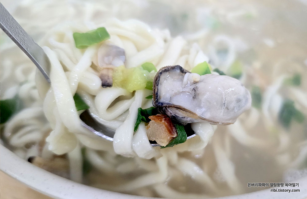 투박한 칼국수면과 바지락을 기본으로 굴과 황태가 들어가 있습니다.