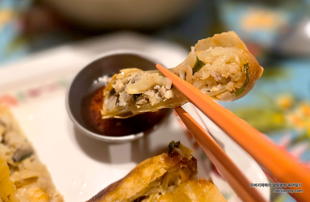 속은 돼지고기, 버섯, 당면 등으로 꽉 차서 든든하고 감칠맛이 넘쳤어요