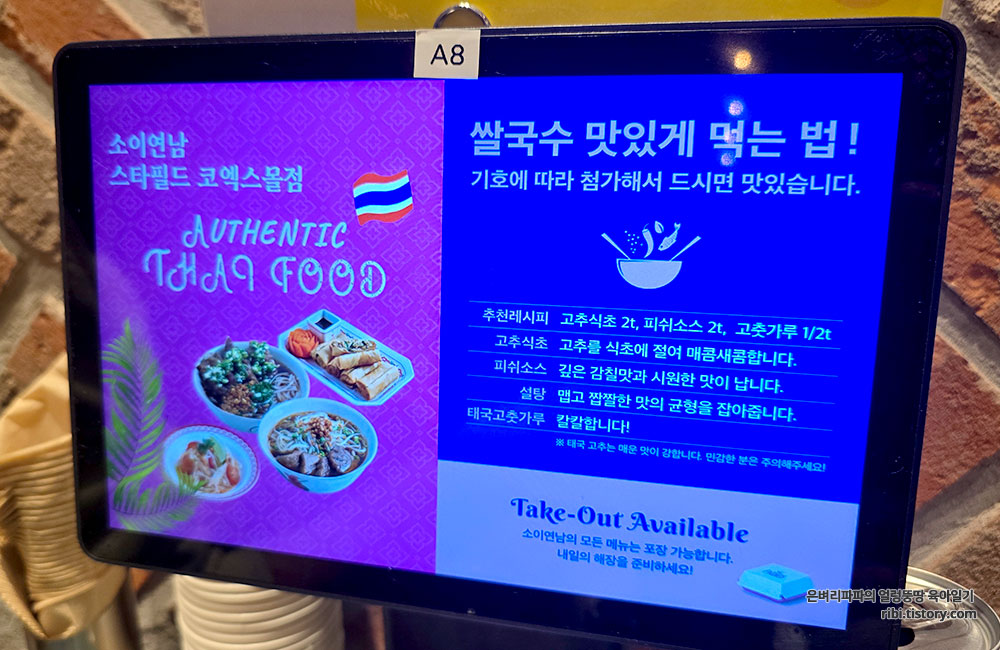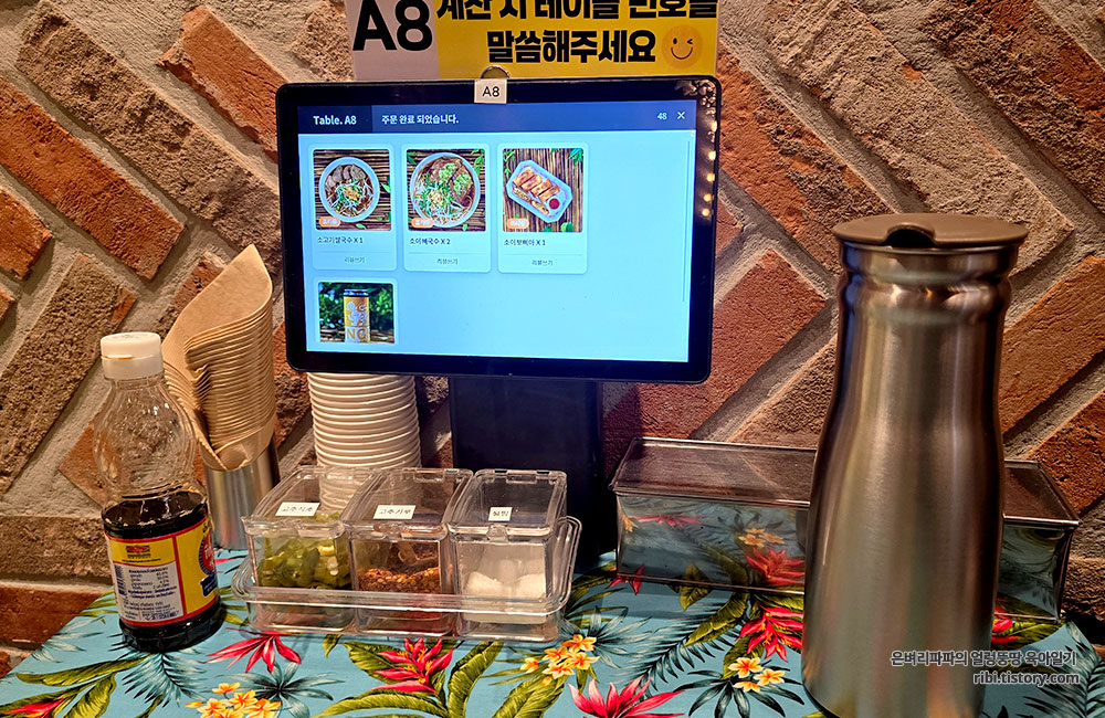 태블릿 아래에 놓여 있던 각종 양념소스의 용도가 잘 설명되어 있어요.