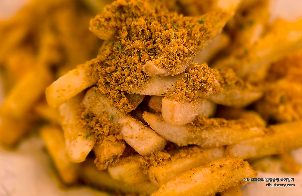 치킨과 감자튀김 위에 풍성하게 뿌려진 독특한 카레코코넛후레이크는 마성의 맛이라고 감히 말할 수 있습니다.
