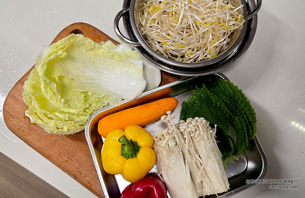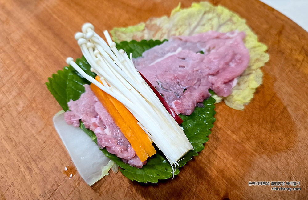 재료 : 알배추, 숙주, 깻잎, 파프리카, 당근, 팽이버섯, 소고기
