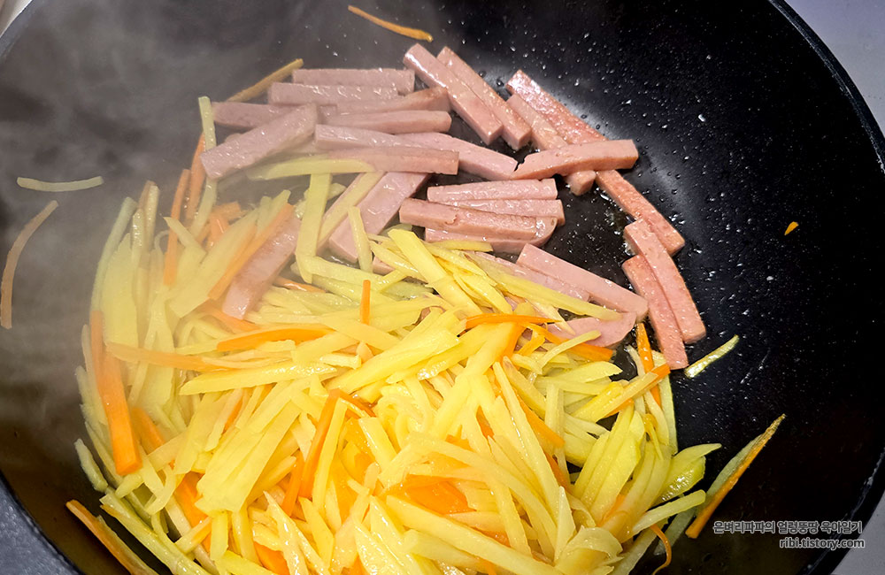 감자와 당근, 햄은 같은 크기로 채 썰어 준비합니다.